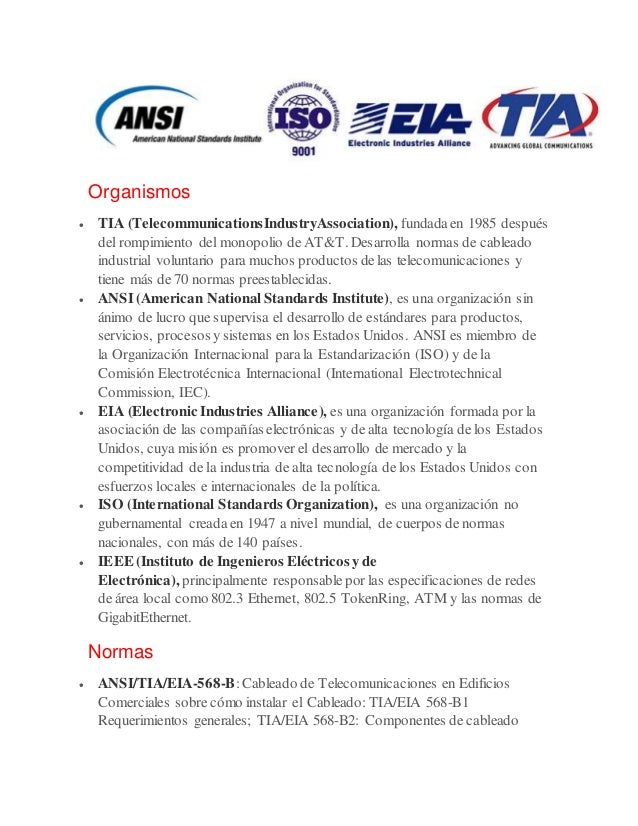Las normas EIA/TIA fueron creadas como norma de industria en un pais, pero se a empleado como norma internacional por ser de las primeras en crearse.